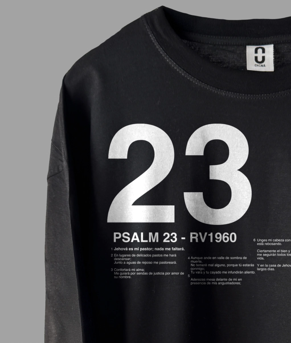 Descubre la comodidad y el estilo de nuestro Remerón negro oversize de algodón. Este diseño moderno y relajado es perfecto para cualquier ocasión, con una estampa frontal con el salmo 23, versiculo de cabecera de muchos!